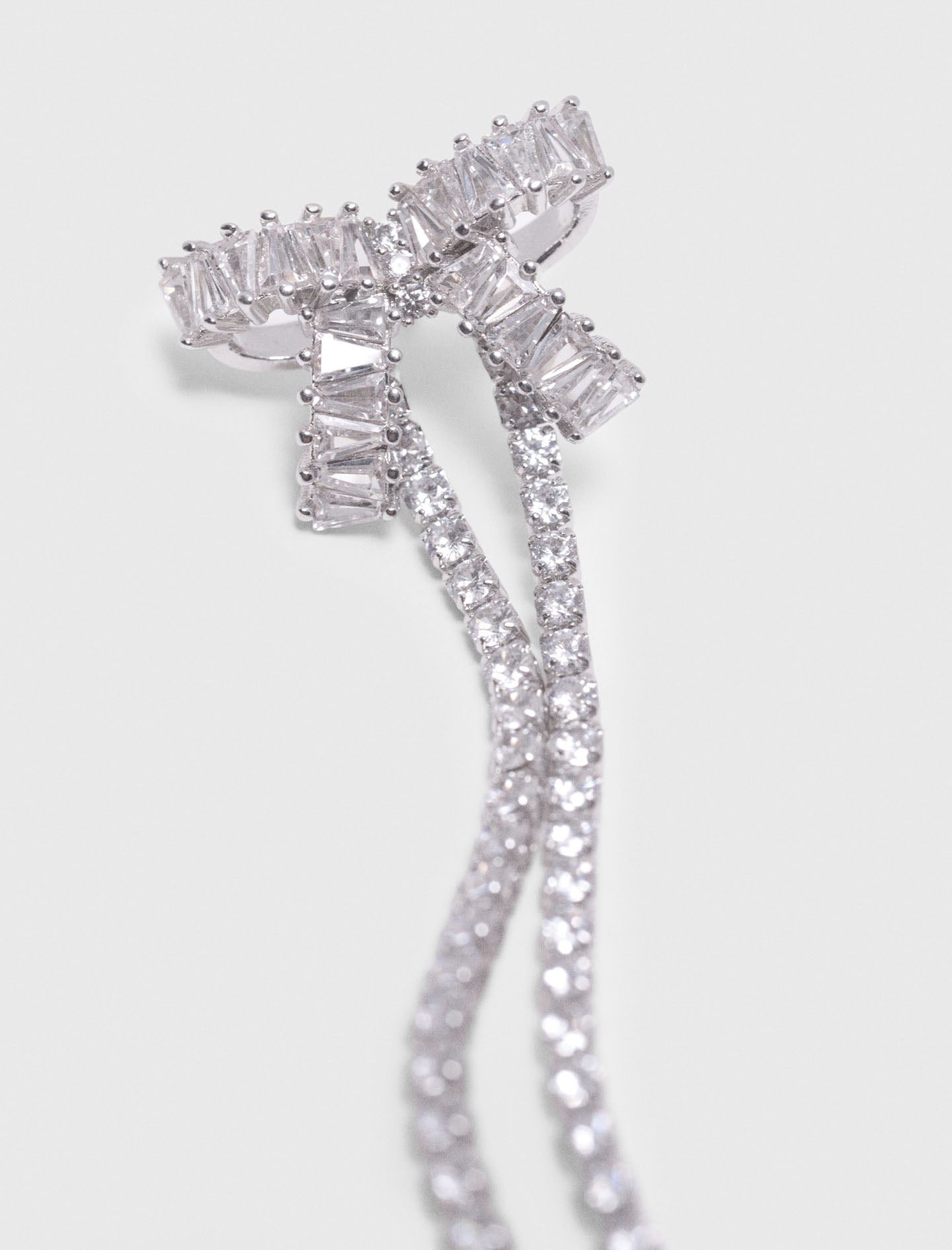 These sparkling earrings are designed with a silver rhinestone bow for a playful touch. A cascade of rhinestones plays with dimensions with two different lengths.