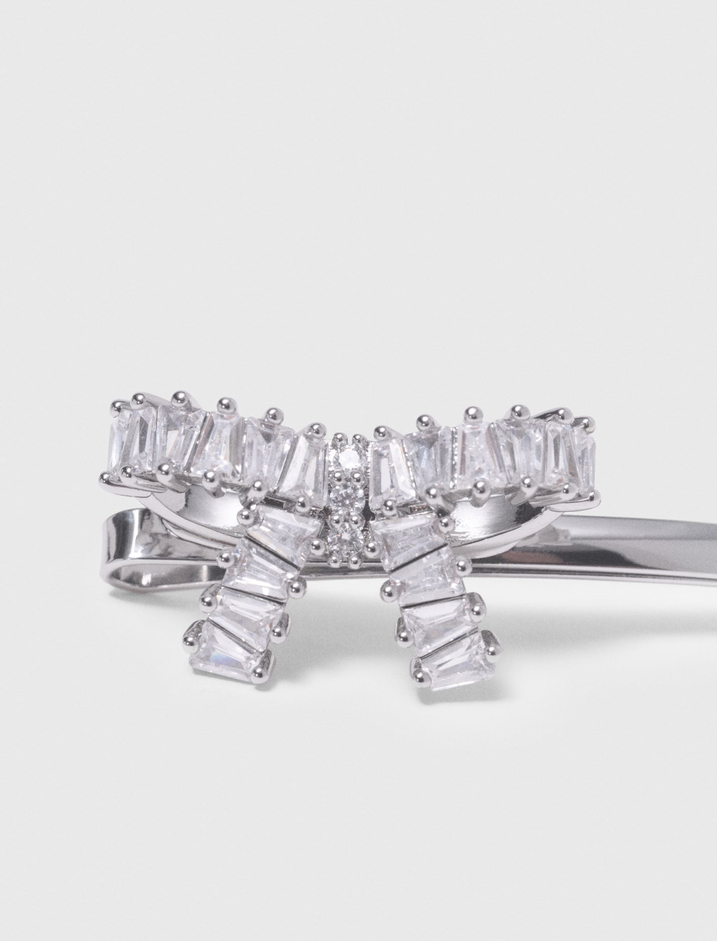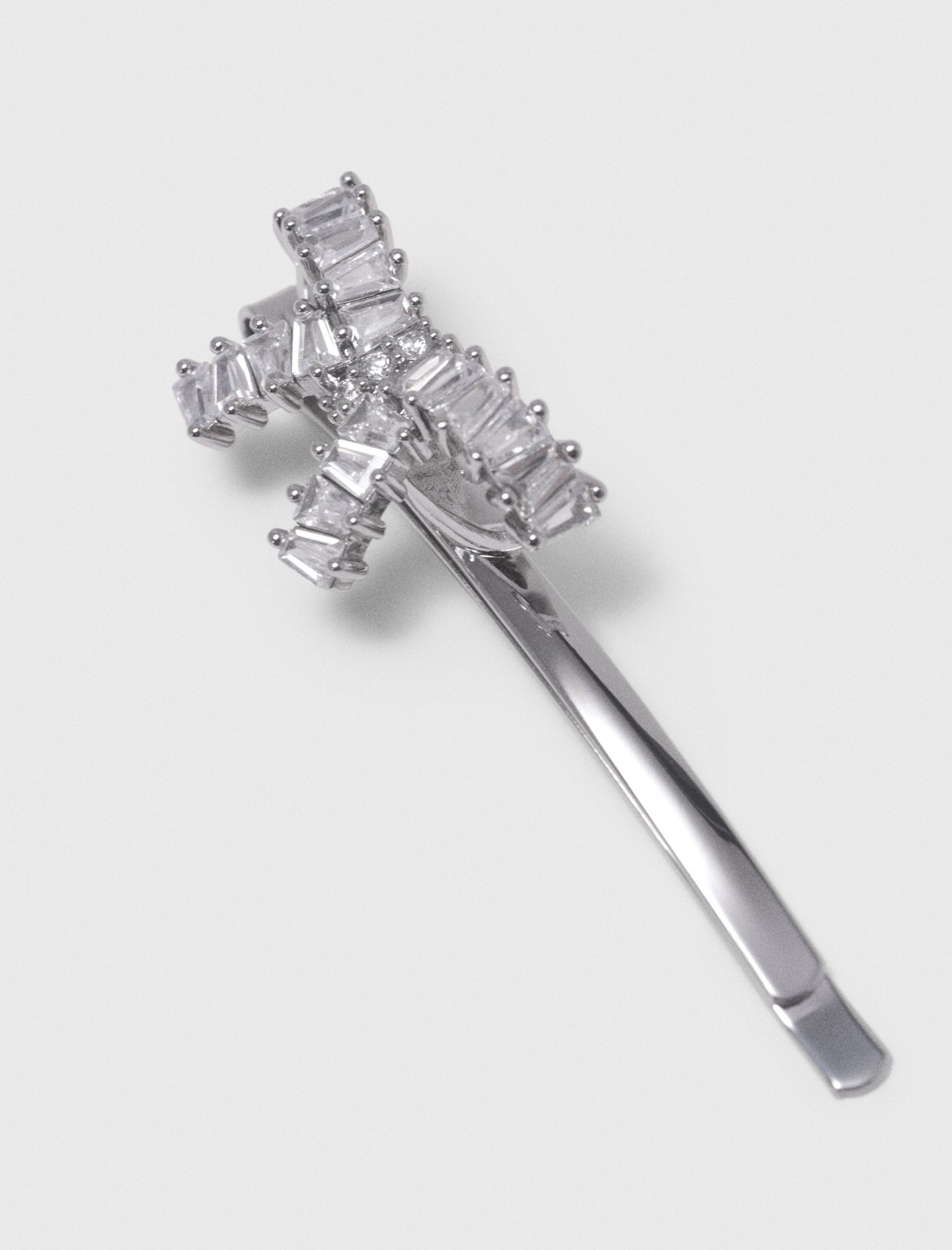 This sculptural, silver-plated brass barrette is set with transparent crystals of different sizes to catch the light from every angle.