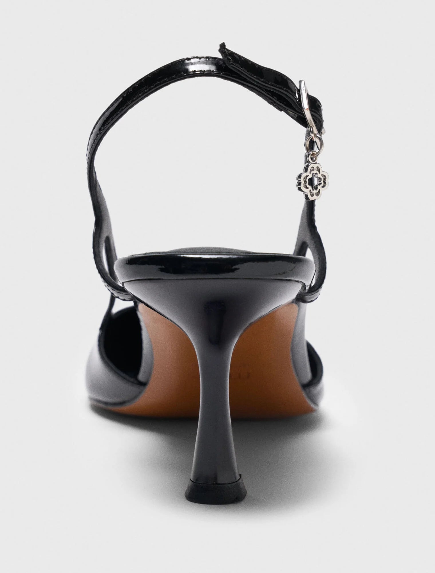 A classic reinvented. Pointed-toe slingback pumps in red patent leather. The adjustable strap, embellished with a Clover charm, elegantly emphasises the ankle.