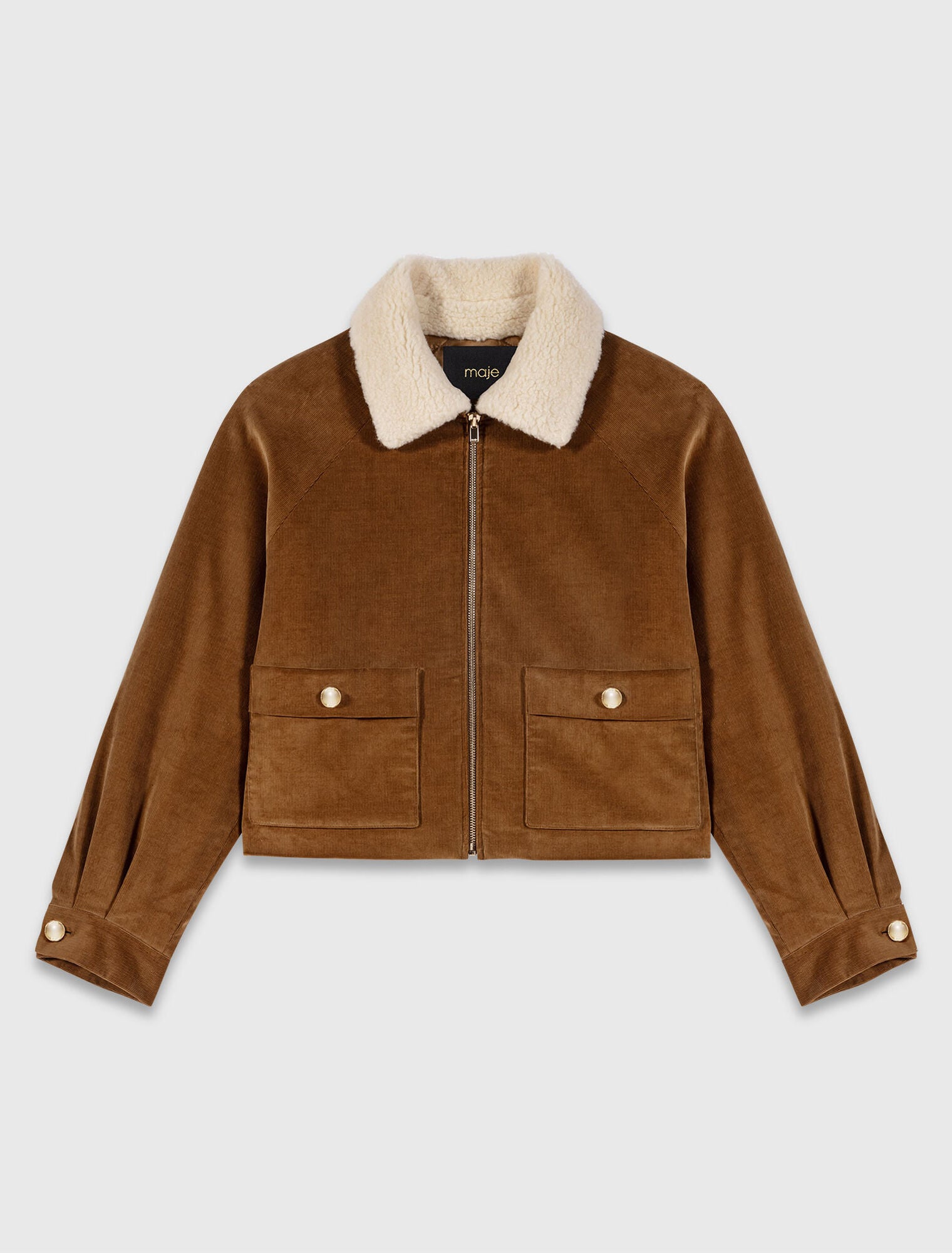 This season is all about comfort, with every fabric enhancing the look. Combining warmth and structure, the pieces feature contrasting details. Here, the corduroy reveals all its depth and is warmed by a fur-effect collar, emphasising a cosy feel. The short cut and raglan sleeves provide freedom of movement, while the butto...