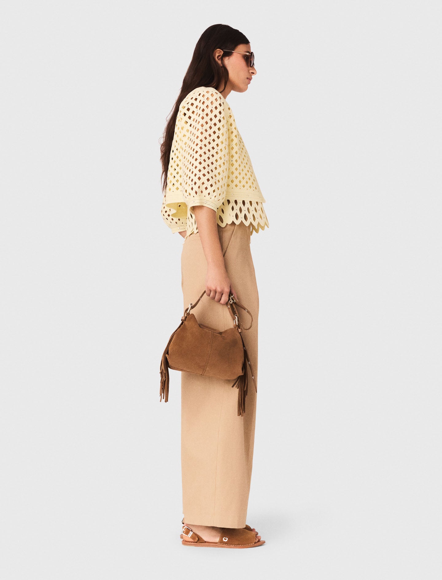 This sky-blue cardigan will win you over with its openwork diamond pattern, structured balloon sleeves and impeccable finishes, while the fabric-covered buttons and contrasting edges create a fresh and sophisticated silhouette.